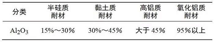 Al?O?-SiO?系耐火材料的基本化學(xué)組成是氧化鋁和二氧化硅,依照氧化鋁含量的高低,將硅鋁系耐火材料劃分為表1幾類。