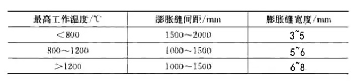 ②現(xiàn)場澆注的爐體?,F(xiàn)場澆注的耐火澆注料爐體留設(shè)膨脹縫的間距和寬度。可參考表1所示。表中數(shù)值適用于黏土質(zhì)和高鋁質(zhì)耐火澆注料。
